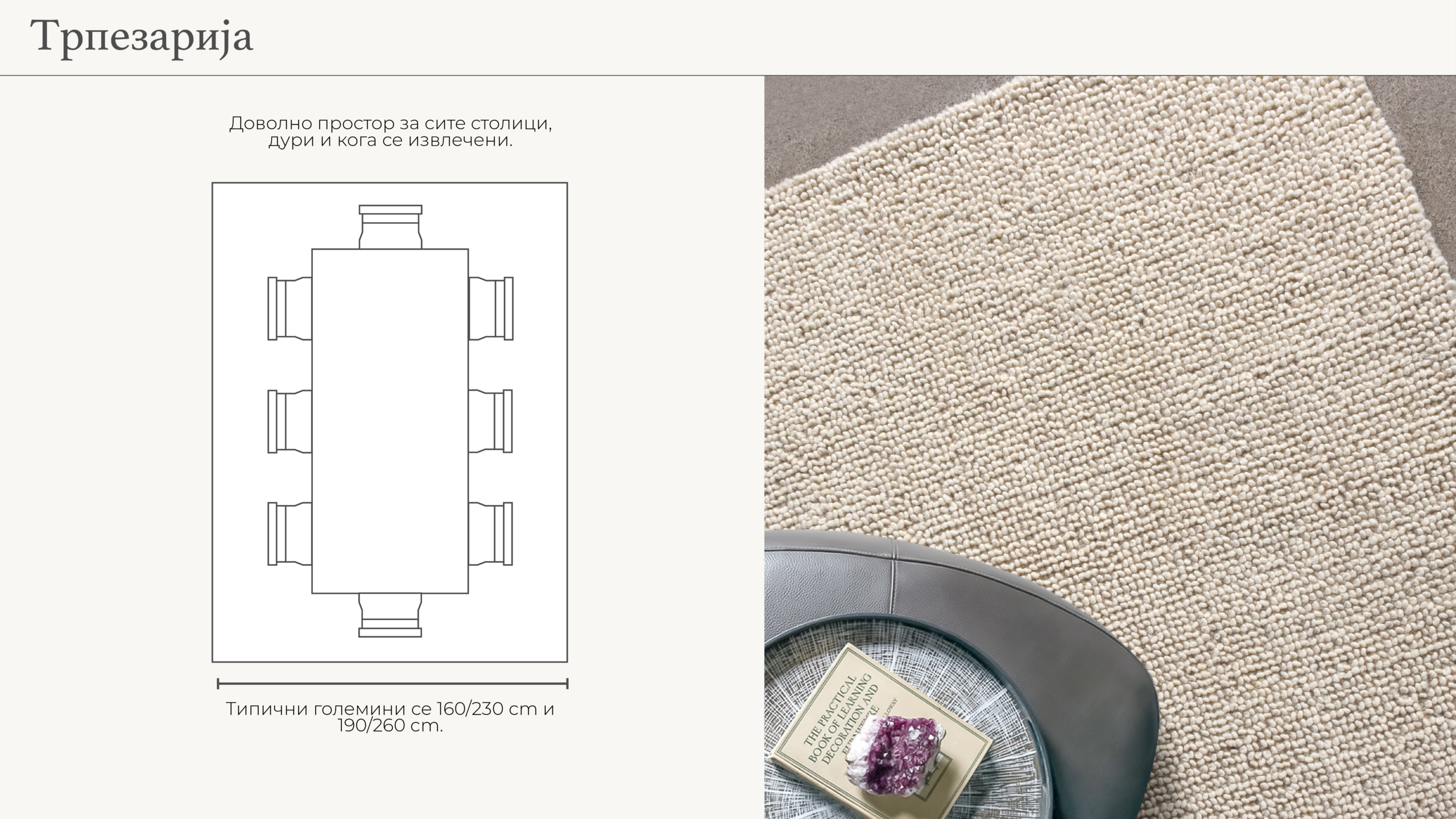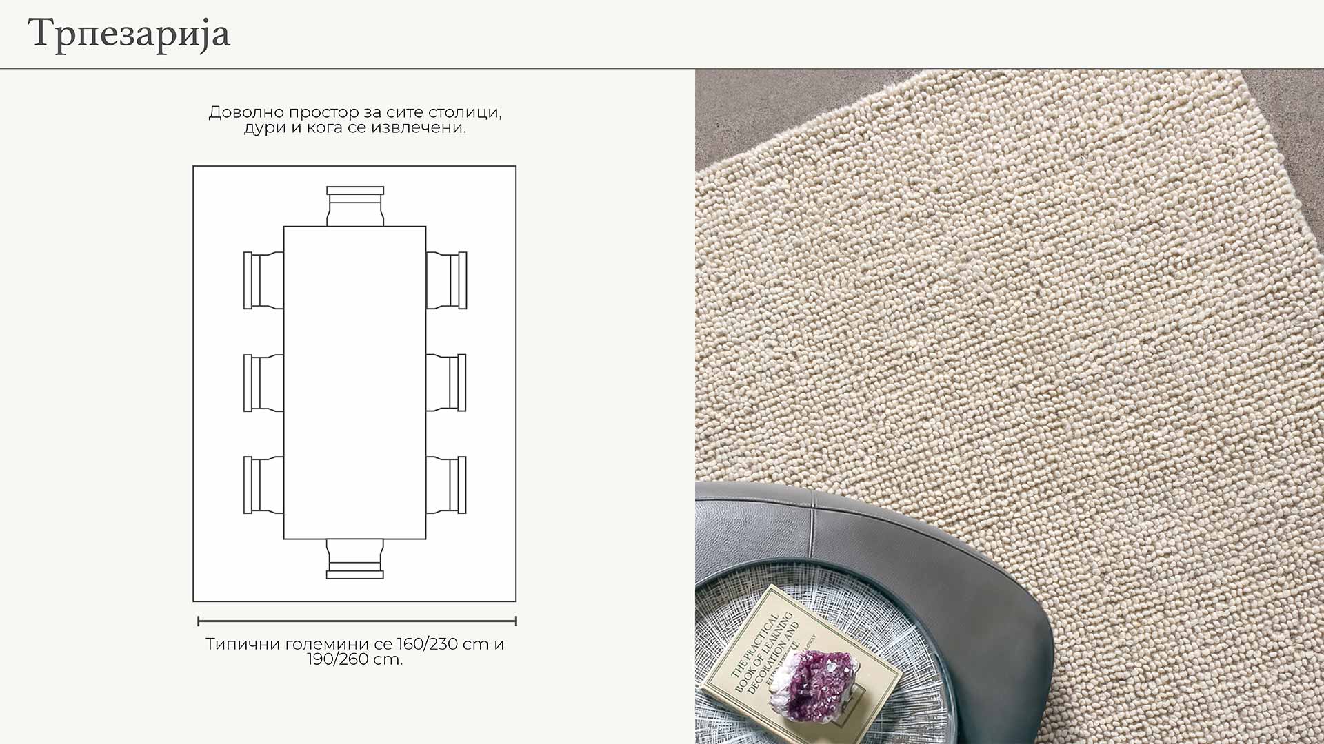 Ако килимот е под трпезариска маса, тој треба да биде доволно голем за столиците да останат врз него и кога ќе се извлечат.