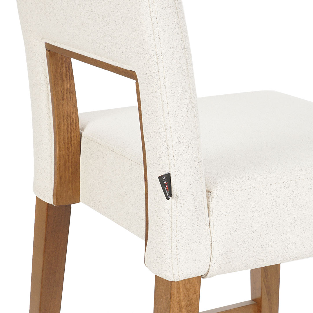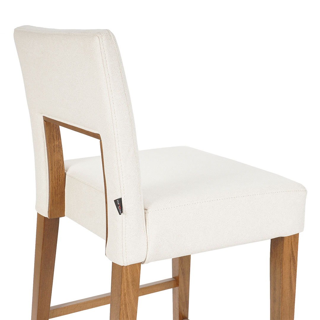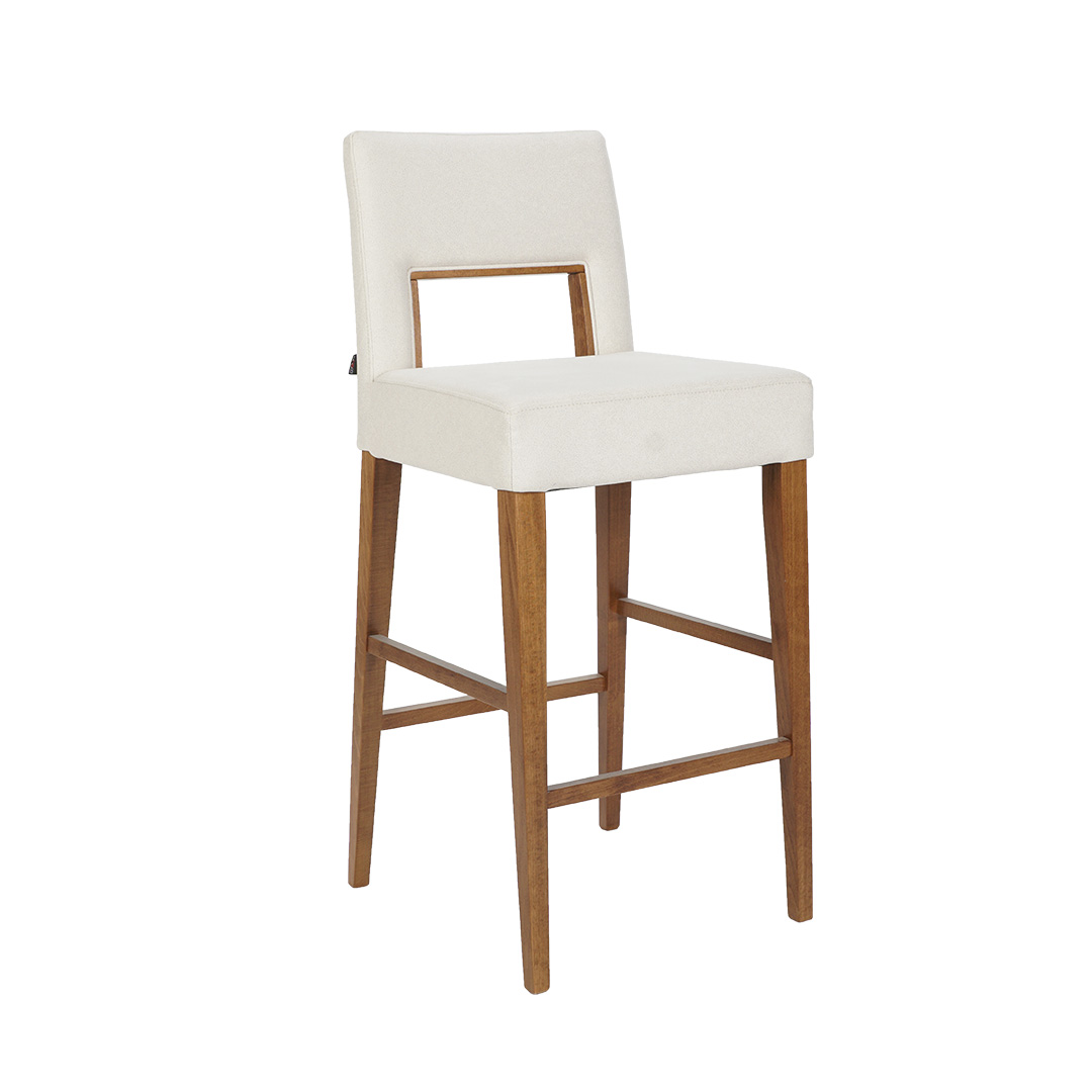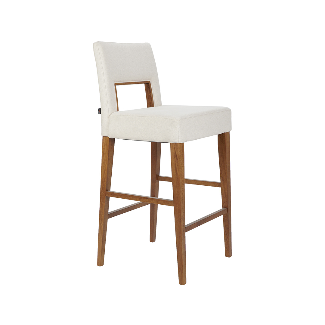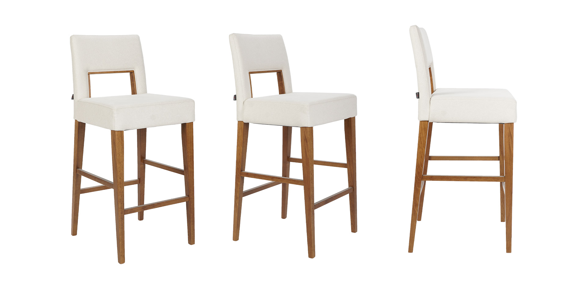 Барската столица Џина е изработена од масивна бука во топла нијанса 3 и обложена со светло крем мебел штоф. Издржлива, стабилна и неверојатно удобна – идеален избор за секој шанк или кујнски остров.