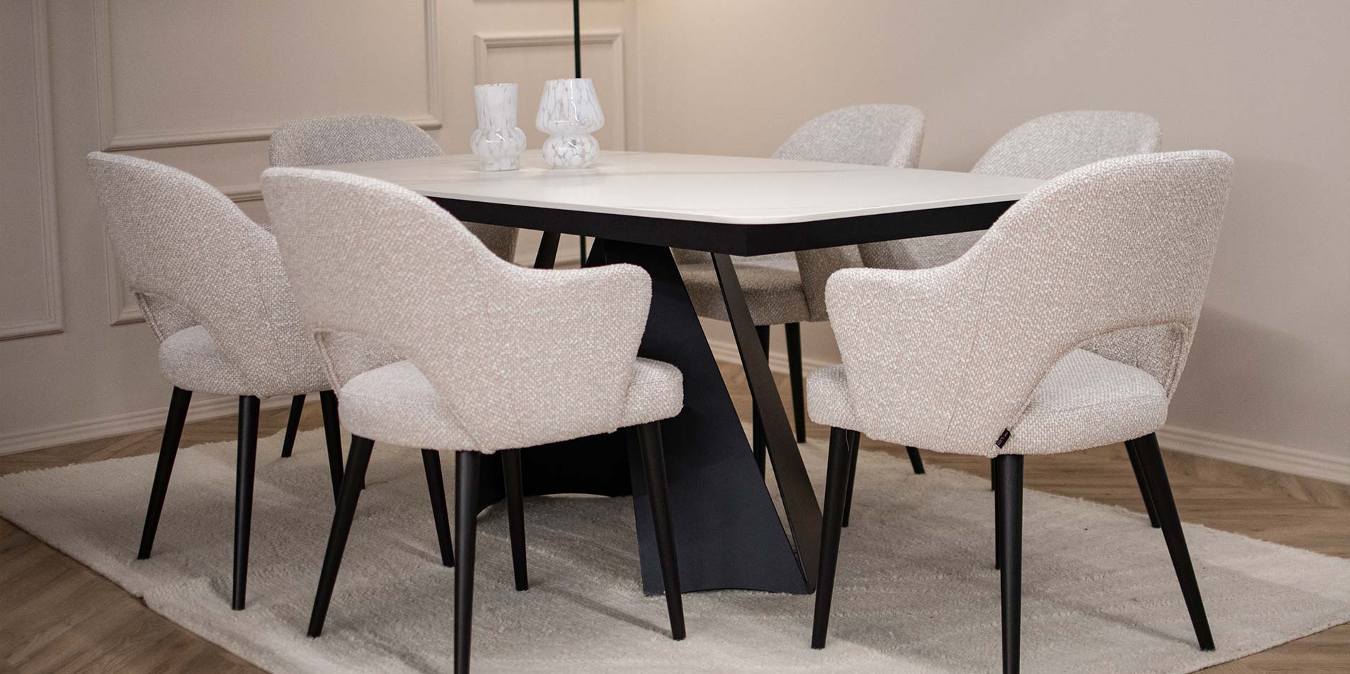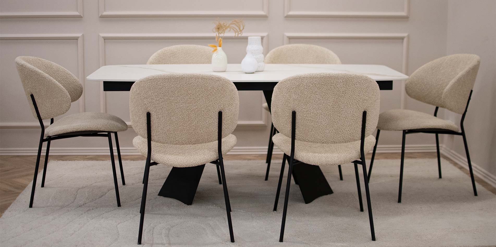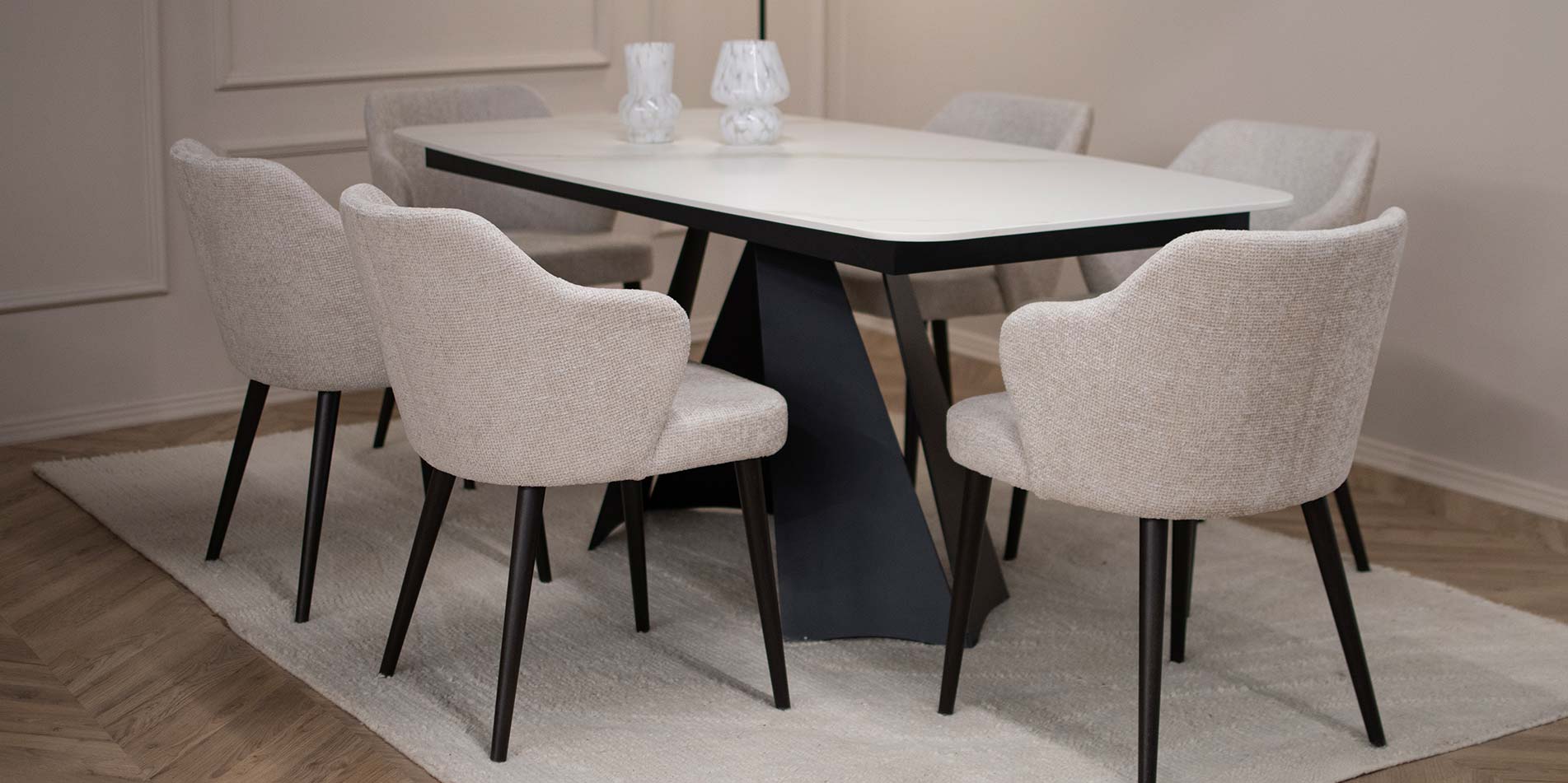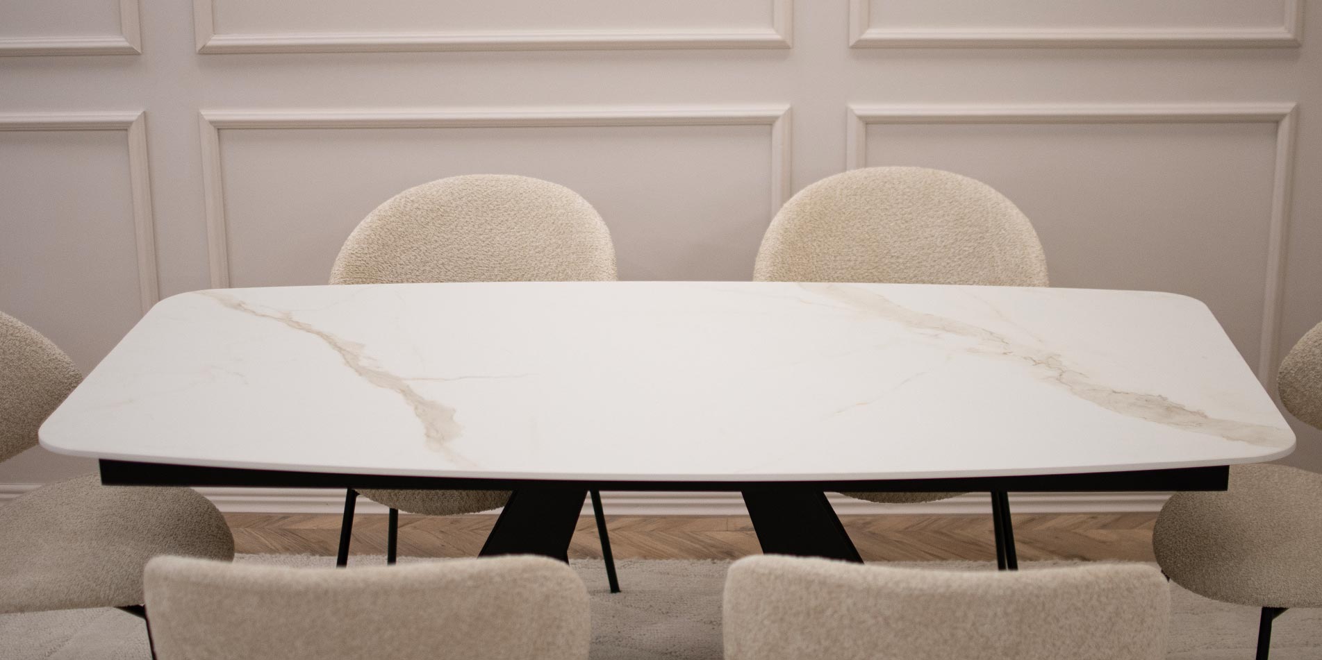 Трпезариската маса Cassini со Laminam керамичка плотна претставува префинет спој на модерен дизајн, издржливи материјали и безвременска естетика. Препознатливите метални ногари со скулптурална форма создаваат силен визуелен акцент во просторот, додека керамичката површина внесува чувство на луксуз, чистота и современ карактер во трпезаријата.