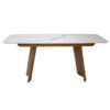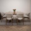 Дизајнот се истакнува со две заоблени ногарки од дрвен фурнир, кои даваат скулптурална форма и стабилност. Масата се изработува во даб или орев, што ја прави идеален избор како дабова трпезариска маса или орев трпезариска маса, со природен изглед и топлина.