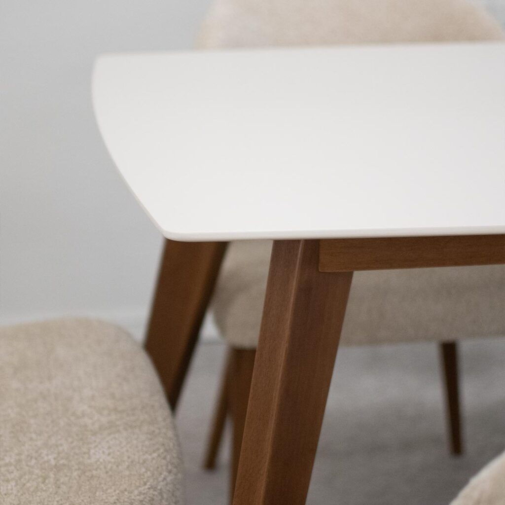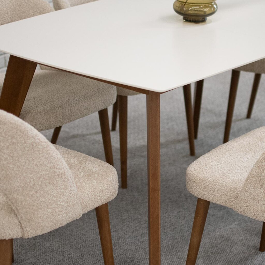 Трпезариски сет со правоаголна маса со беле мат плотна и бука ногарки во кафаева боја, во комабинација со столици со отвор во грбот, изработени во крем букле и бука кафеава боја ногарки.