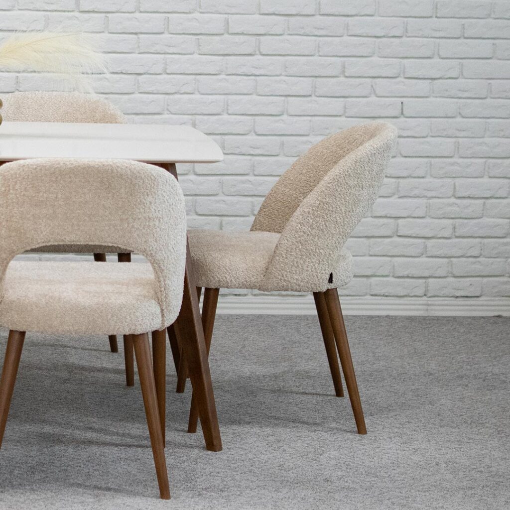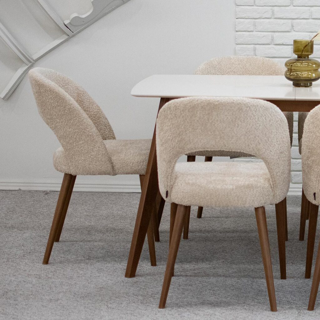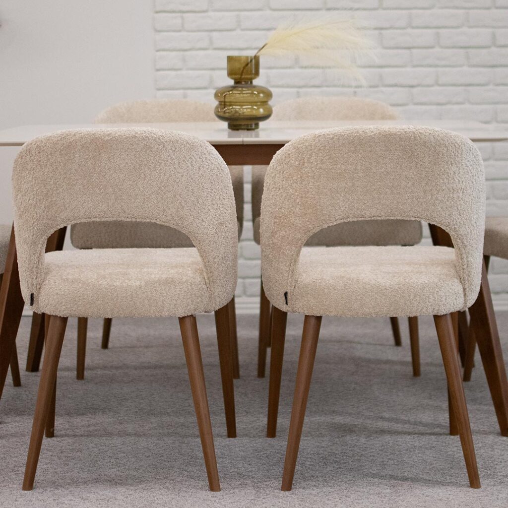 Трпезариски столици со отвор во грбот, изработени во крем букле и бука кафеава боја ногарки.